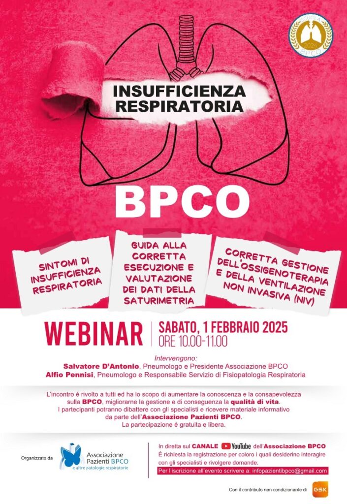 Sintomi di insufficienza respiratoria – Guida alla corretta esecuzione e valutazione dei dati della saturimetria – Corretta gestione dell’ossigenoterapia e della ventilazione non invasiva (NIV) con Salvatore D’Antonio, Pneumologo e Presidente Associazione BPCO, Alfio Pennisi, Pneumologo e Responsabile Servizio di Fisiopatologia Respiratoria – 1° febbraio 2025.